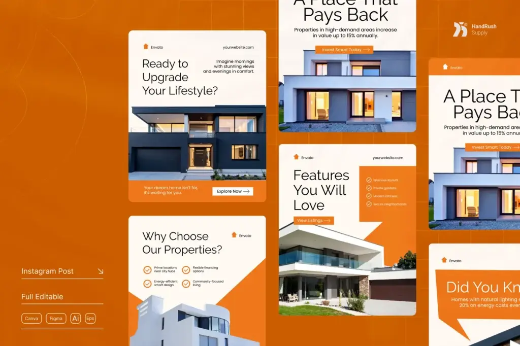 Nepremičninske agencije se pogosto borijo s tem, da oglasi izgledajo neprofesionalno, nepregledno ali premalo privlačno. Težko izpostavijo ključne informacije, kot so cena, lokacija in velikost. Grafične predloge rešijo te izzive z jasnimi, preglednimi in vizualno privlačnimi postavitvami, ki poudarijo bistvo. Predstavitve in oglasi izgledajo bolj profesionalno, kar poveča zaupanje kupcev in prepoznavnost agencije.